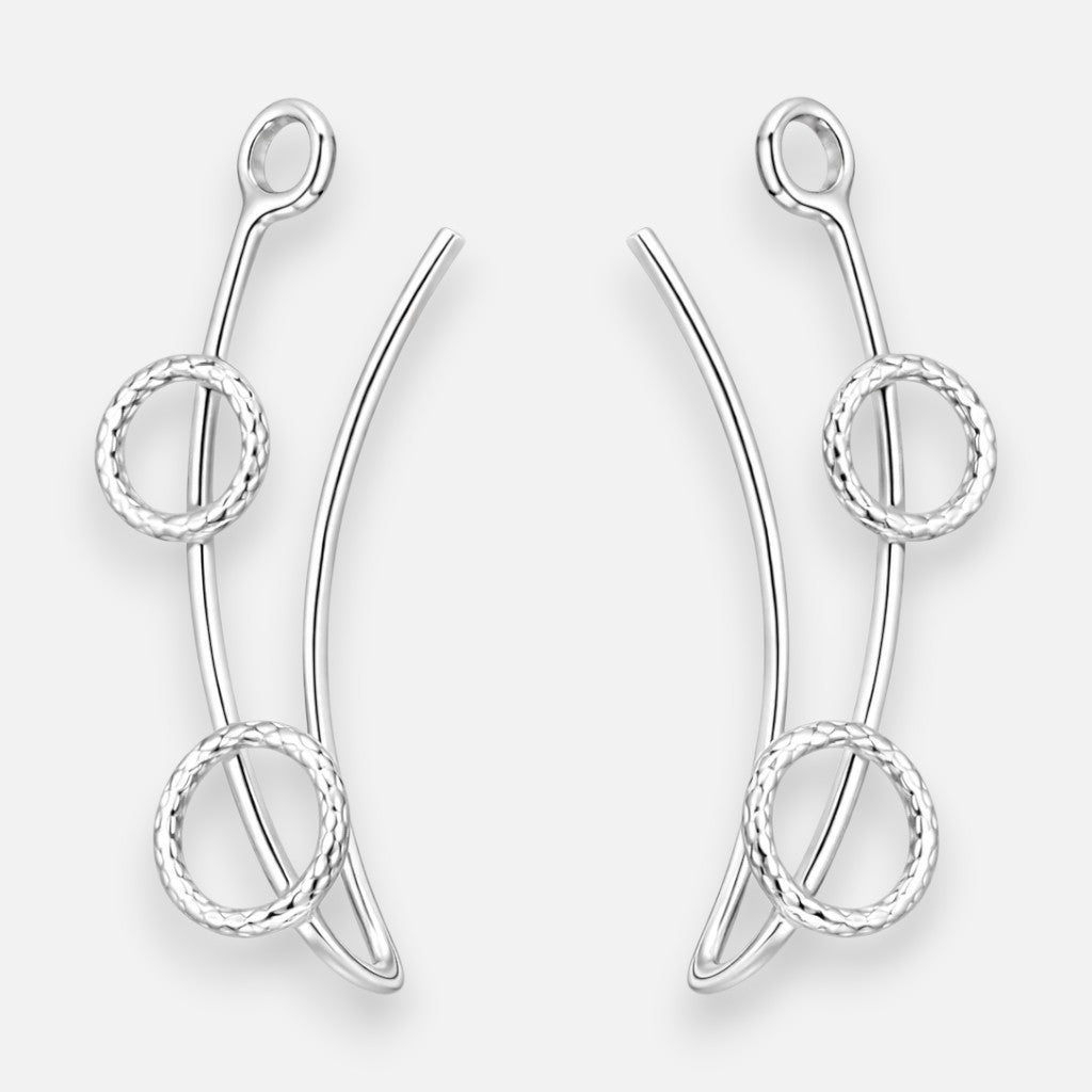 Aro trepador en plata 925 con diseño minimalista de círculos facetados. Perfecto para un look elegante y versátil que se adapta a cualquier ocasión. Su estructura delicada permite usarlo solo o combinado con otros aros para crear tu propio estilo. Ideal para quienes buscan joyería de calidad que trascienda las tendencias. Alto: 21 mm