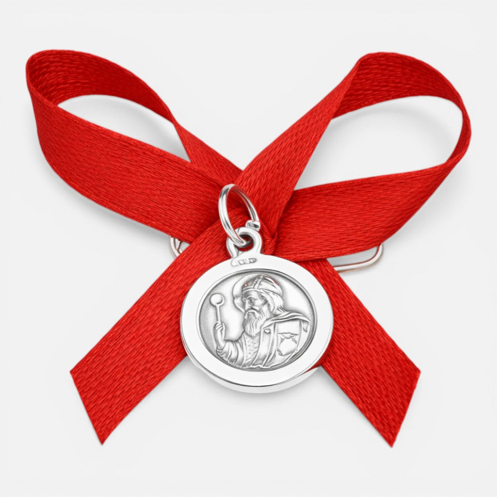 Prendedor San Benito en plata y cinta roja, diseñado especialmente para proteger a los más pequeños de la casa. Esta medalla religiosa de 12 mm combina fe y devoción en un accesorio delicado y versátil. Perfecto como regalo significativo para bautizos, comuniones o momentos especiales de fe.