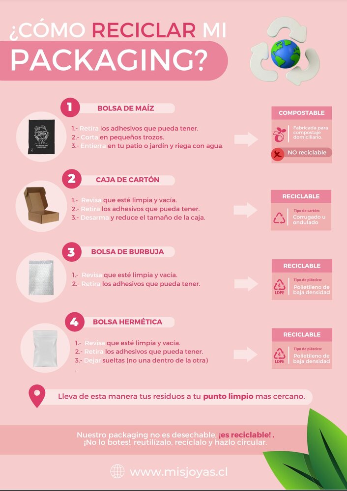 Recuerda que con estas pequeñas acciones podemos generar grandes cambios. Siguiendo estas indicaciones estarás listo para ¡reciclar tu packaging! de Misjoyas.cl, llevándolo a tu punto limpio mas cercano.