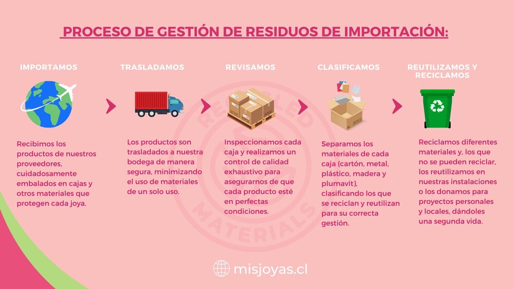 En "Mis Joyas", nos comprometemos con la sostenibilidad en cada uno de nuestros procesos, incluyendo la gestión de los residuos que llegan junto con nuestros productos importados. Estos envíos traen diferentes tipos de materiales de embalaje que debemos manejar de manera responsable para reducir nuestro impacto ambiental. Desde grandes cajas hasta pequeños plásticos de protección, clasificamos y gestionamos cada tipo de residuo para fomentar el reciclaje y la reutilización.